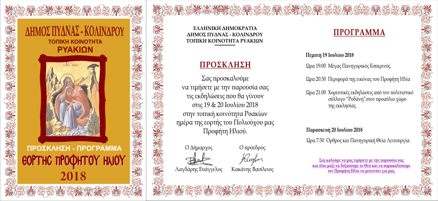 Σας προσκαλούμε να τιμήσετε με την παρουσία σας τις εκδηλώσεις που θα πραγματοποιηθούν στη Τοπική Κοινότητα Ρυακίων στις 19 & 20 Ιουλίου για τον εορτασμό του Πολιούχου Προφήτη Ηλίου