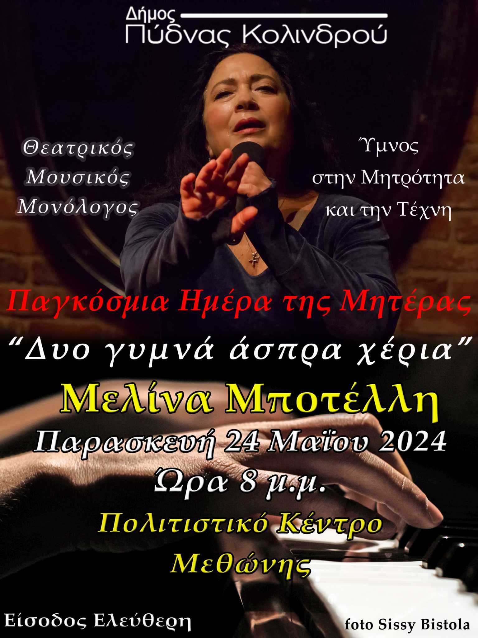 Στον θαυμάσιο χώρο του πολιτιστικού κέντρου Μεθώνης Πιερίας του Δήμου Πύδνας Κολινδρού θα παρουσιαστεί ο θεατρικός- μουσικός μονόλογος ΔΥΟ ΓΥΜΝΑ ΑΣΠΡΑ ΧΕΡΙΑ την ΠΑΡΑΣΚΕΥΗ 24 Μαϊου 2024 στις 8 μμ.