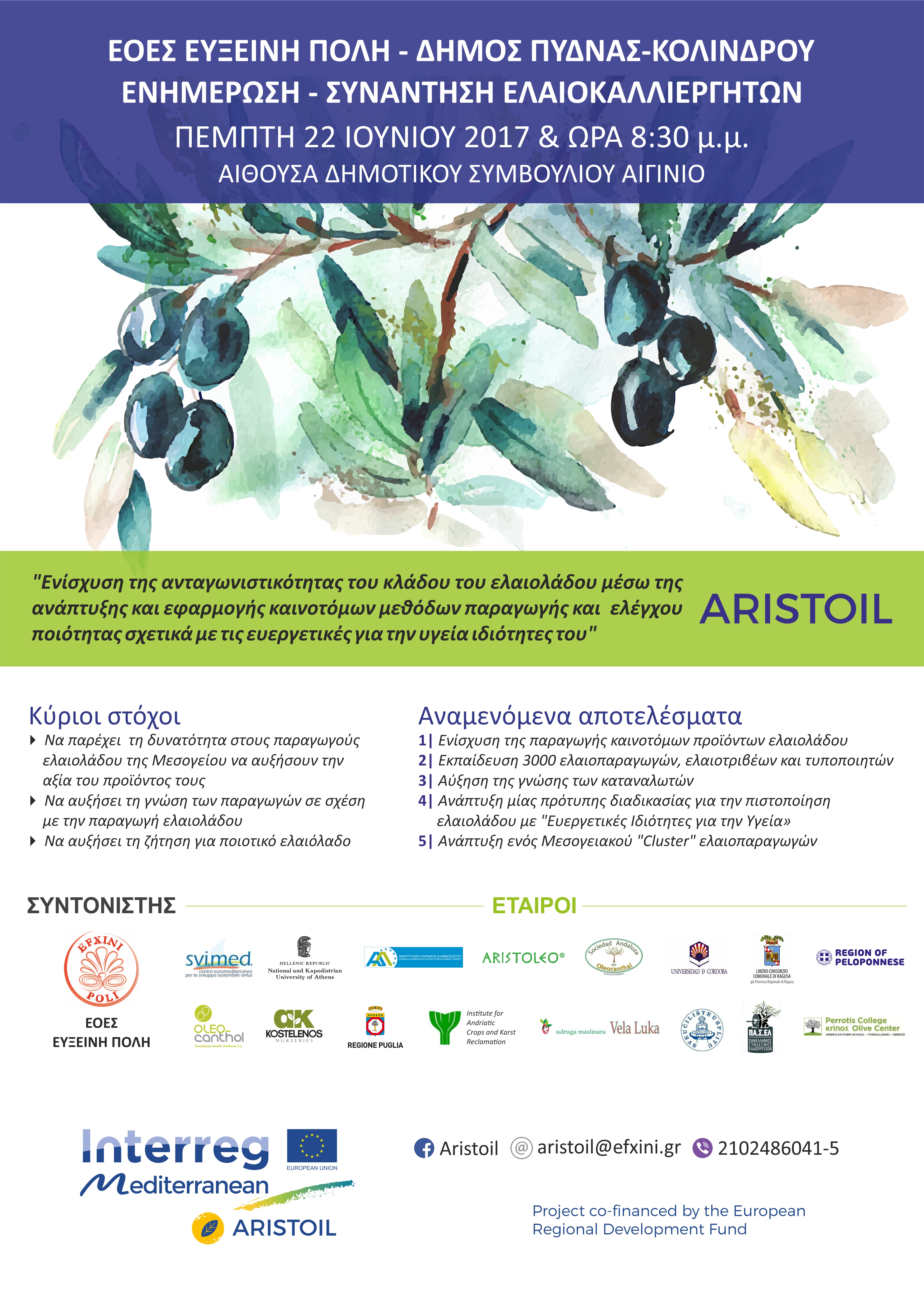 Ο Δήμος Πύδνας Κολινδρού, ως μέλος του Ευρωπαϊκού Ομίλου Εδαφικής Συνεργασίας (ΕΟΕΣ) ΕΥΞΕΙΝΗ ΠΟΛΗ, συμμετέχει στο Ευρωπαϊκό Πρόγραμμα, ARISTOIL που ως στόχο έχει την "Ενίσχυση της ανταγωνιστικότητας του κλάδου του ελαιολάδου μέσω της ανάπτυξης και εφαρμογής καινοτόμων μεθόδων παραγωγής και ελέγχου ποιότητας σχετικά με τις ευεργετικές για την υγεία ιδιότητες του".