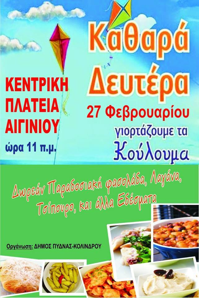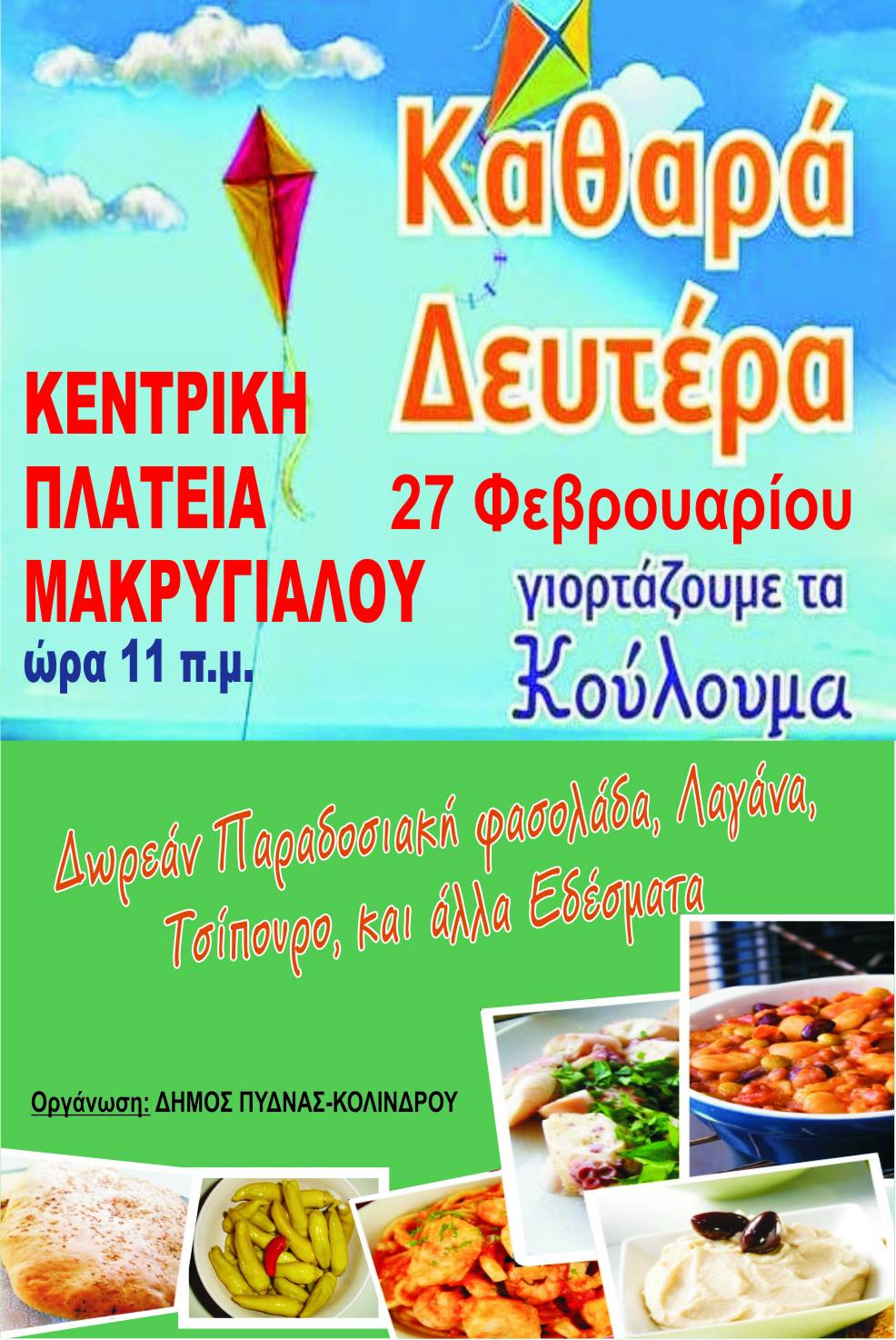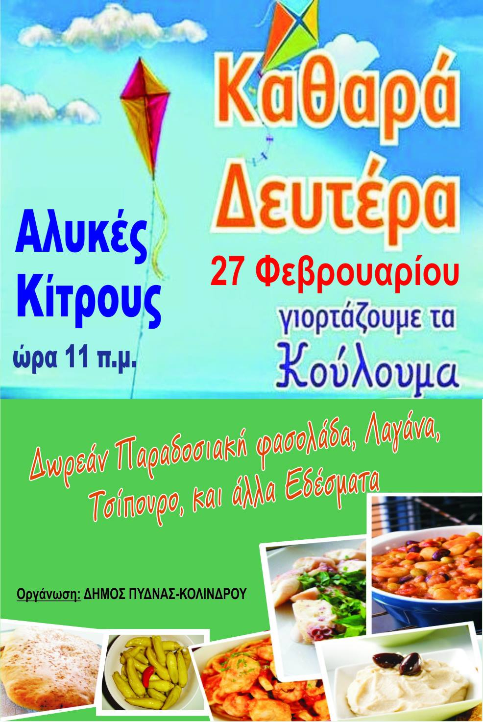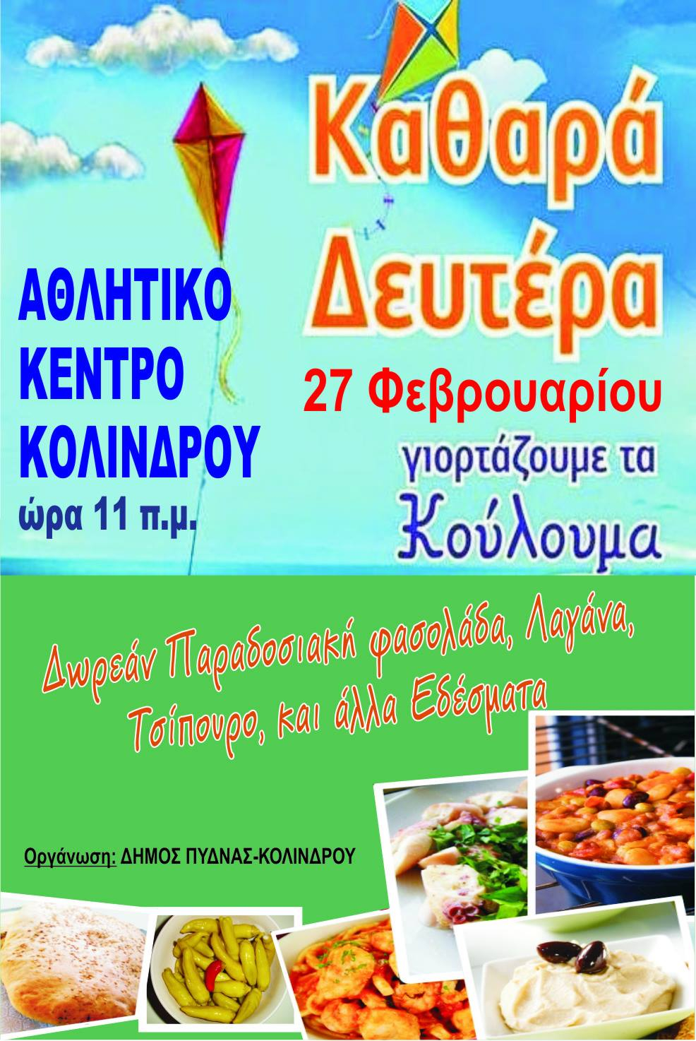 Την Καθαρά Δευτέρα, στις 27 Φεβρουαρίου 2017, γιορτάζουμε όλοι μαζί τα «ΚΟΥΛΟΥΜΑ» με δωρεάν νηστίσιμα εδέσματα