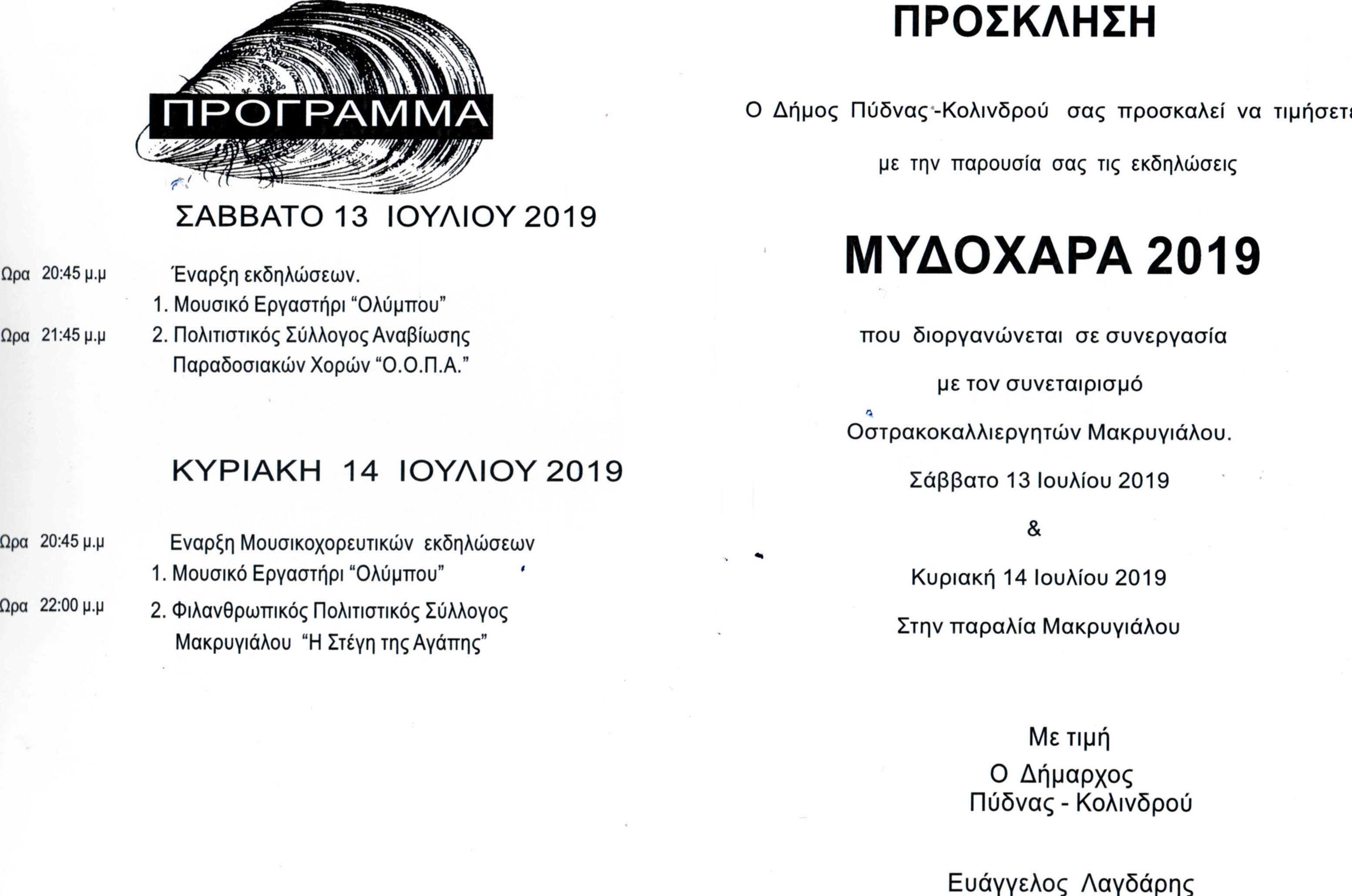 Ο Δήμος Πύδνας Κολινδρού σας προσκαλεί να τιμήσετε με την παρουσία σας τις εκδηλώσεις της Μυδοχαράς 2019 που διοργανώνεται σε συνεργασία με τον συνεταιρισμό Οστρακοκαλλιεργητών Μακρυγιάλου Σάββατο 13 & Κυριακή 14 Ιουλίου 2019 στην παραλία Μακρυγιάλου.