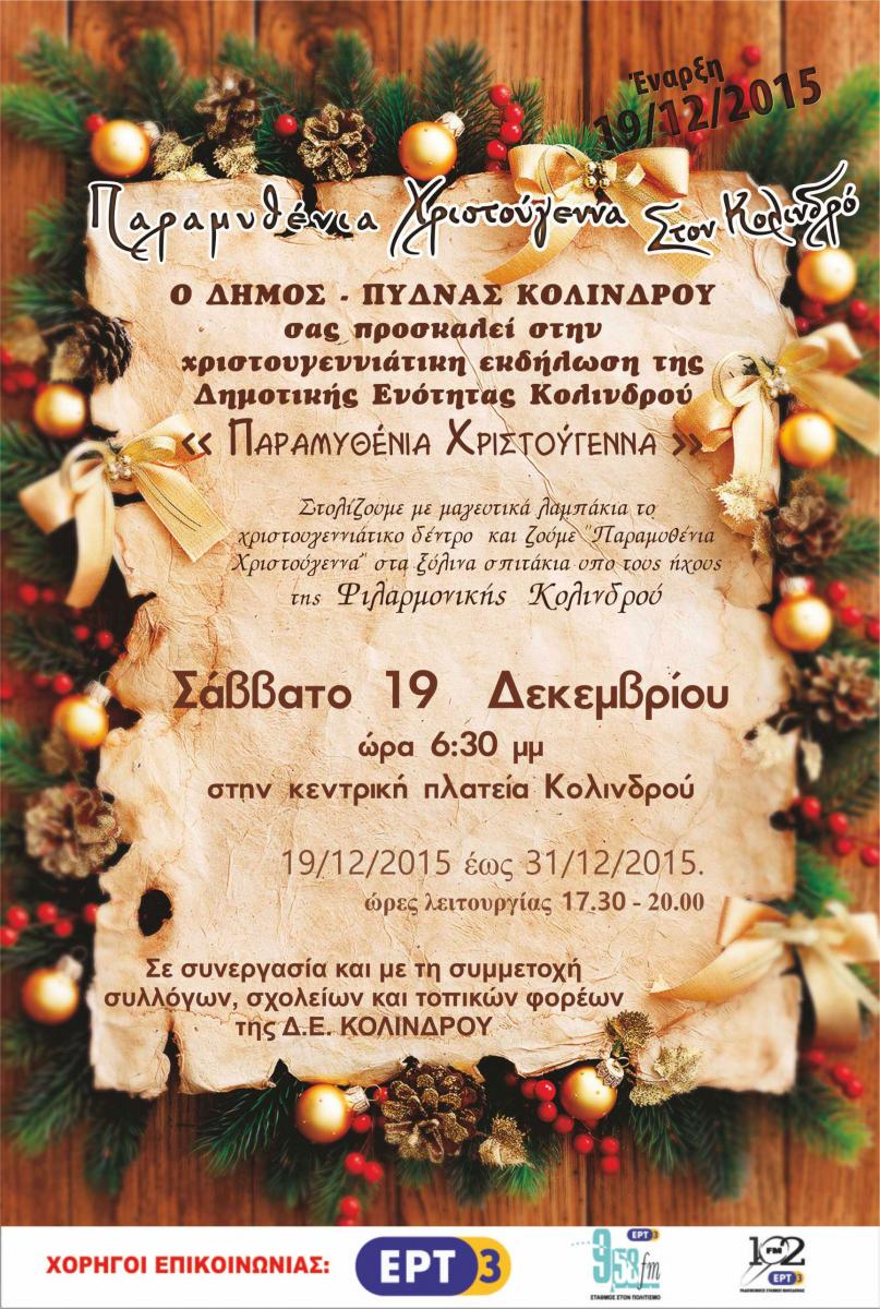 Ο Δήμος Πύδνας-Κολινδρού σε συνεργασία και με την συμμετοχή όλων των Φορέων της Δημοτικής Ενότητας Κολινδρού και υπό τους ήχους της Φιλαρμονικής Κολινδρού σας προσκαλούν το Σάββατο 19 Δεκεμβρίου 2015 και ώρα 6:30 μμ στην Κεντρική Πλατεία Κολινδρού για να στολίσουμε το Χριστουγεννιάτικο Δέντρο στα "Παραμυθένια Χριστούγεννα" του Κολινδρού.