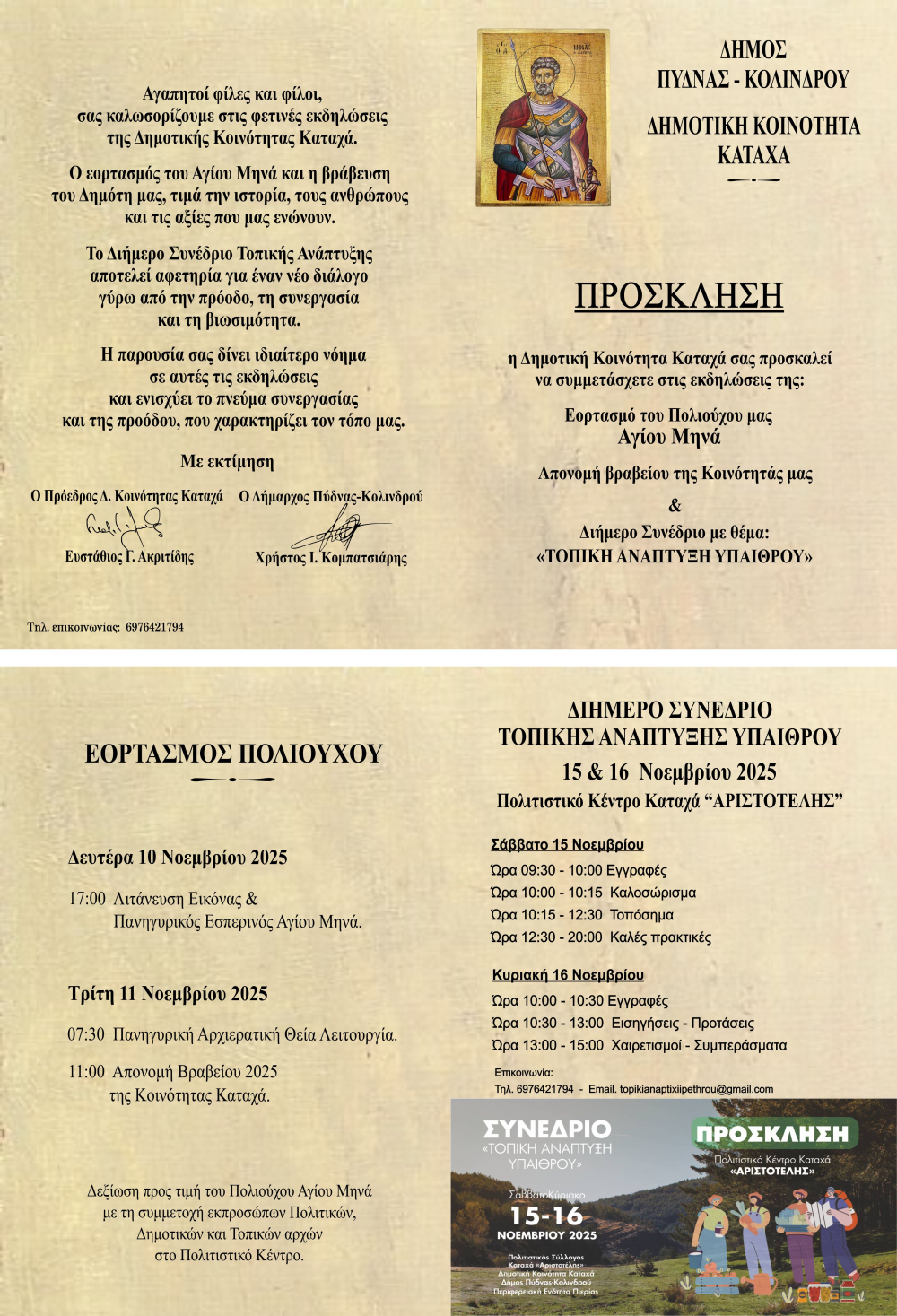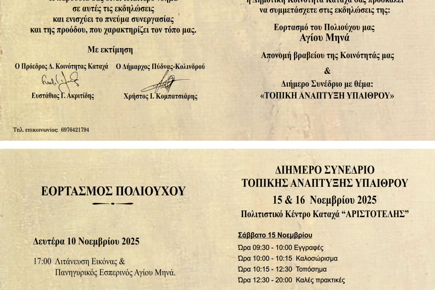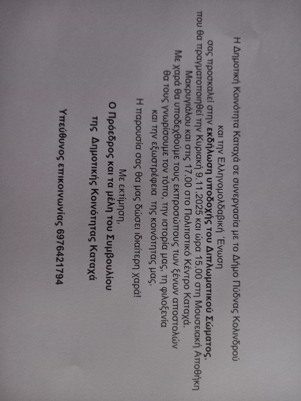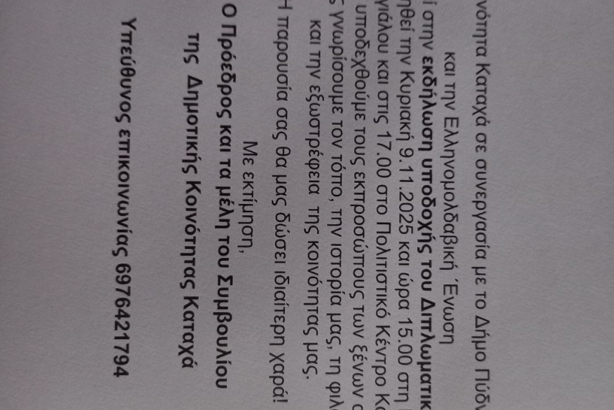 Η Δημοτική Κοινότητα Καταχά, σε συνεργασία με τον Δήμο Πύδνας – Κολινδρού και την Ελληνομολδαβική Ένωση, σας προσκαλεί στην εκδήλωση υποδοχής του Διπλωματικού σώματος, που θα πραγματοποιηθεί την Κυριακή 9 Νοεμβρίου 2025 και ώρα 15:00 στη Μουσειακή Αποθήκη Μακρυγιάλου και στις 17:00 στο Πολιτιστικό κέντρο Καταχά.