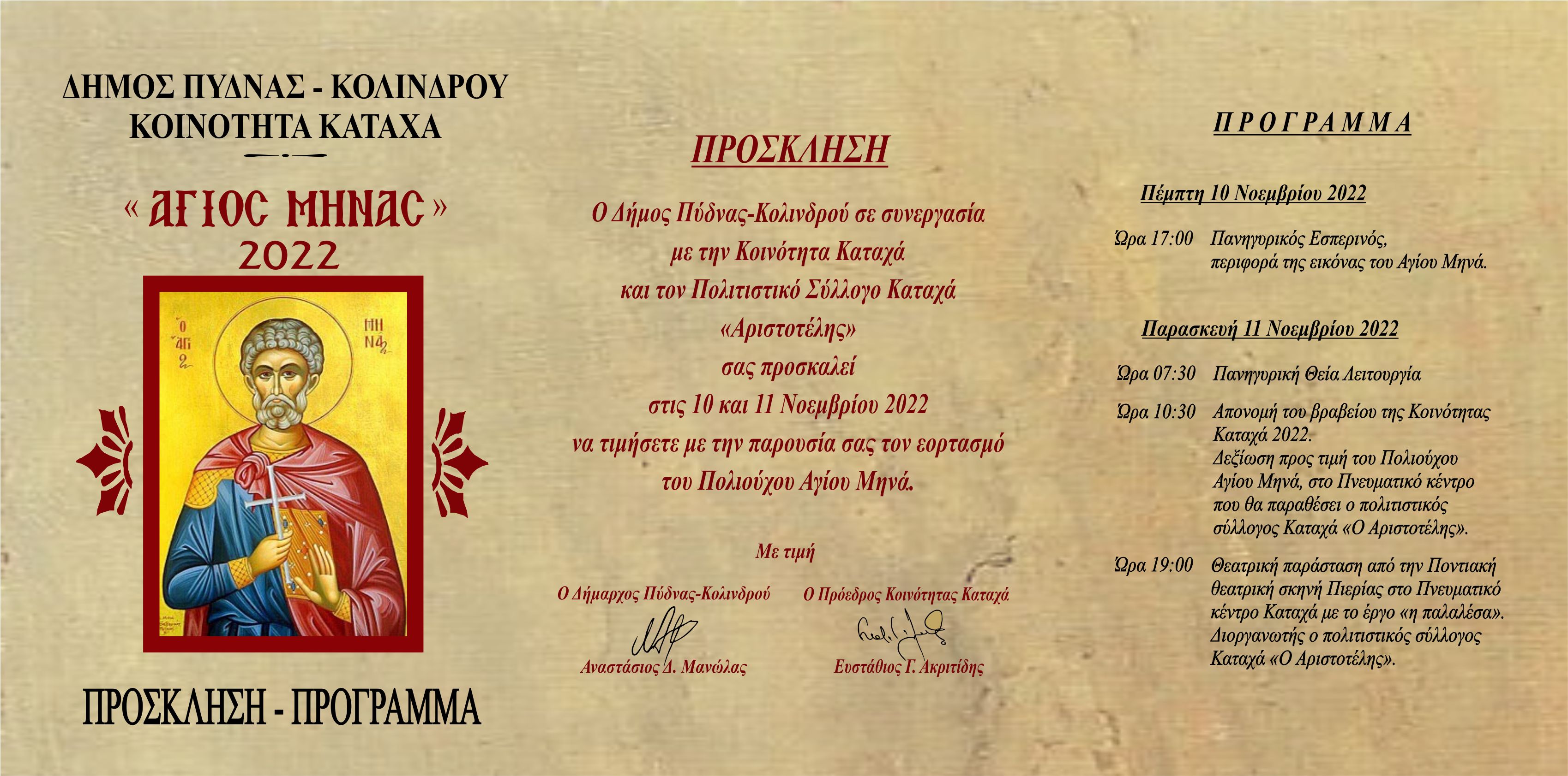 Ο Δήμαρχος Πύδνας-Κολινδρού σε συνεργασία με την Κοινότητα Καταχά και τον Πολιτιστικό σύλλογο Καταχά "ΑΡΙΣΤΟΤΕΛΗΣ" σας προσκαλεί στις 10 & 11 Νοεμβρίου 2022 να τιμήσετε με την παρουσία σας τον εορτασμό του Πολιούχου Αγίου Μηνά