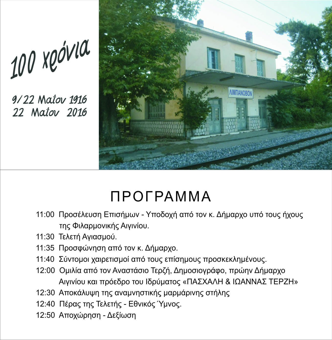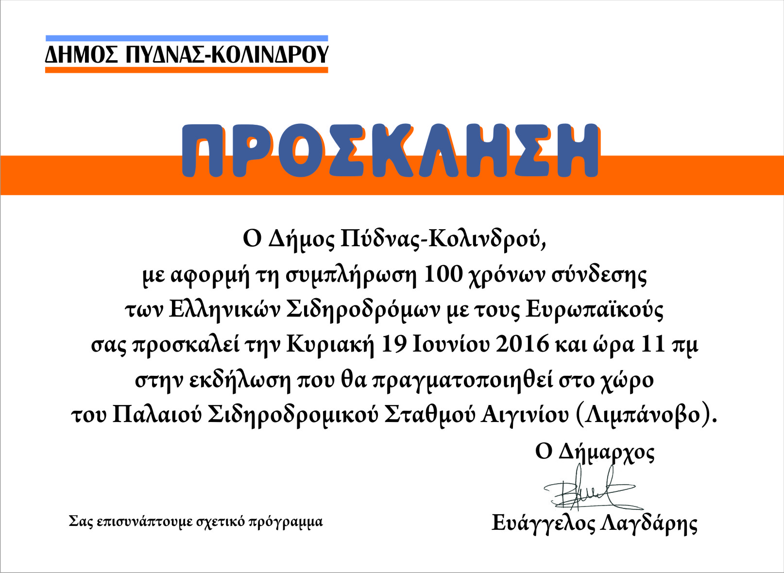 Με αφορμή τη συμπλήρωση 100 χρόνων σύνδεσης των Ελληνικών σιδηροδρόμων με τους Ευρωπαϊκούς, ο Δήμος Πύδνας Κολινδρού πραγματοποιεί επετειακή αναμνηστική εκδήλωση, την Κυριακή 19 Ιουνίου 2016 και ώρα 11 π.μ., στον χώρο του Παλαιού Σιδηροδρομικού Σταθμού Αιγινίου (ΛΙΜΠΑΝΟΒΟ).