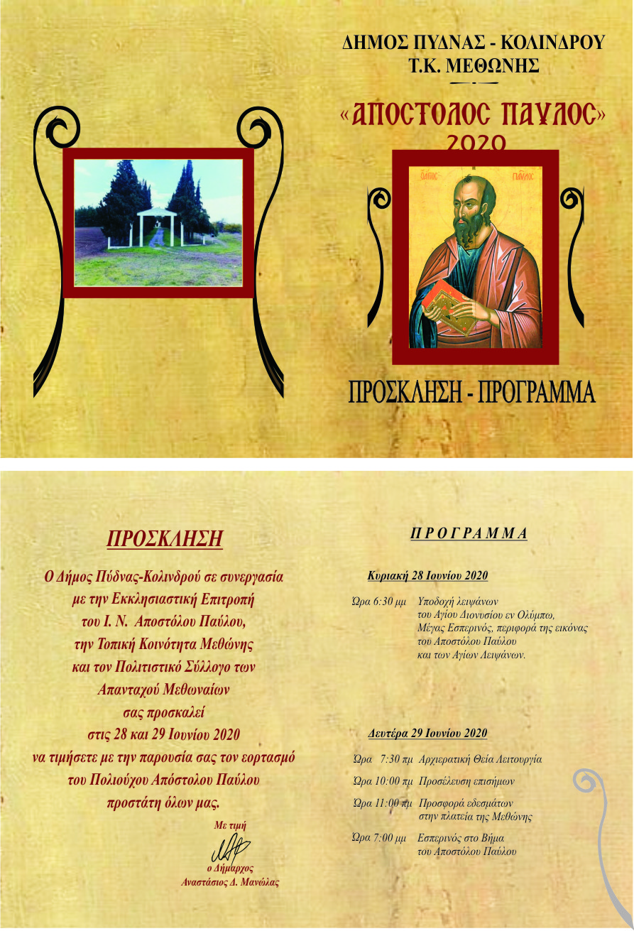 Ο Δήμος Πύδνας-Κολινδρού σε συνεργασία με την εκκλησιαστική επιτροπή του Ι.Ν. Αποστόλου Παύλου, την Τ.Κ. Μεθώνης και τον Πολιτιστικό Σύλλογο Απανταχού Μεθωναίων, σας προσκαλεί στις 28 & 29 Ιουνίου 2020 να τιμήσετε με την παρουσία σας τον εορτασμό του Πολιούχου Αποστόλου Παύλου