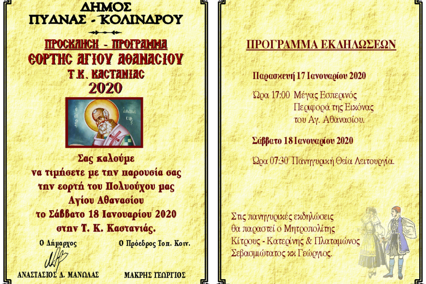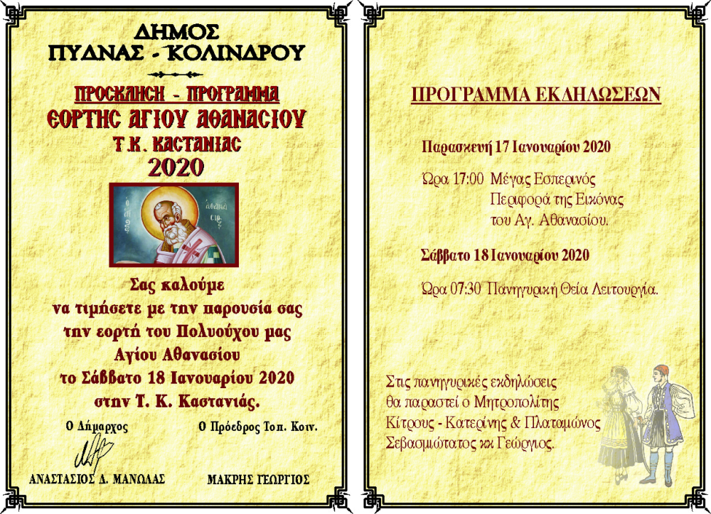 Σας καλούμε να τιμήσετε με την παρουσία σας την εορτή του Πολιούχου Καστανιάς Αγίου Αθανασίου το Σάββατο 18 Ιανουαρίου 2020