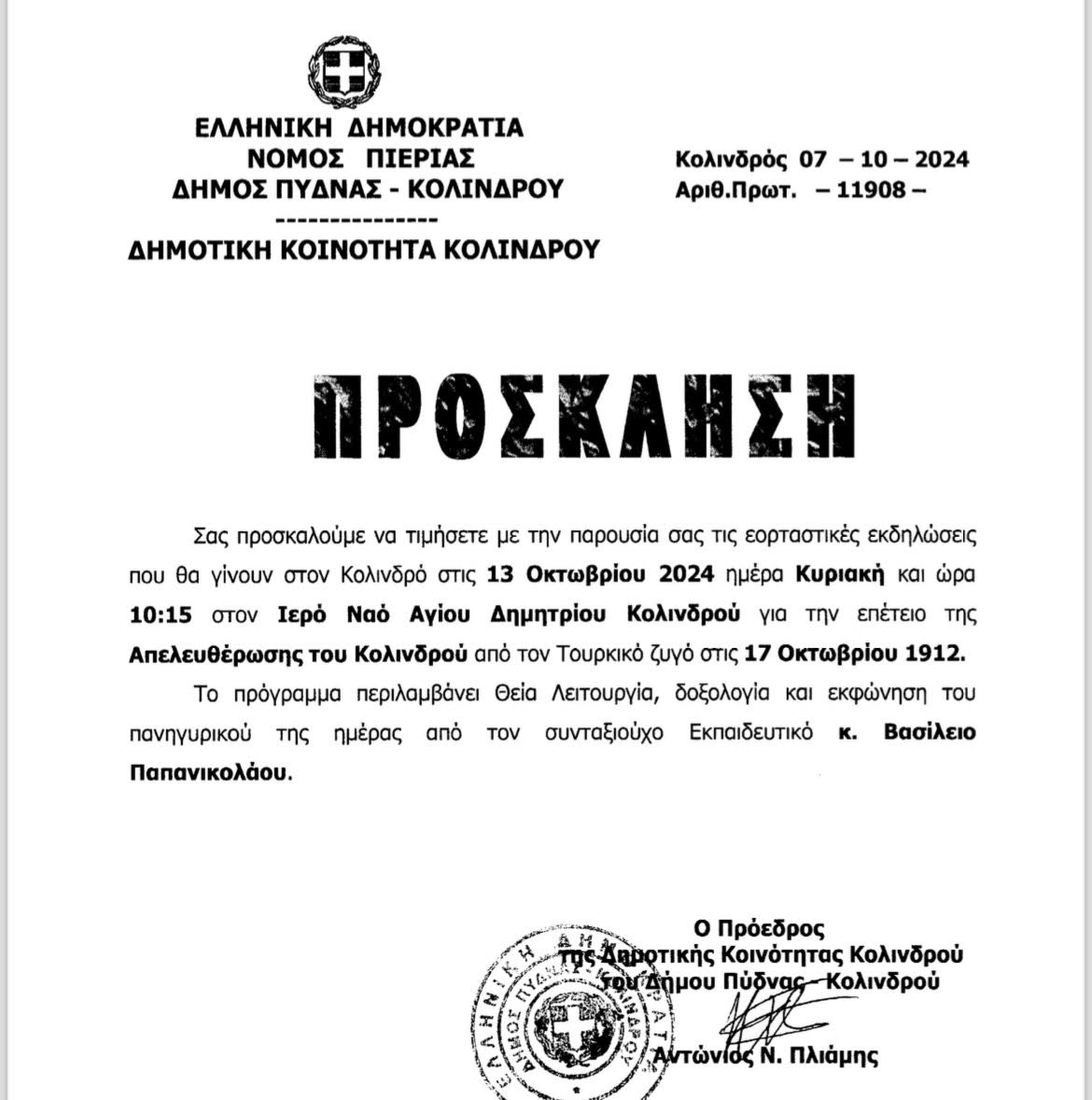 Σας προσκαλούμε να τιμήσετε με την παρουσία σας τις εορταστικές εκδηλώσεις που θα γίνουν στον Κολινδρό στις 13 Οκτωβρίου 2024 ημέρα Κυριακή και ώρα 10:15 στον Ιερό Ναό Αγίου Δημητρίου Κολινδρού για την επέτειο της Απελευθέρωσης του Κολινδρού από τον Τουρκικό ζυγό στις 17 Οκτωβρίου 1912.