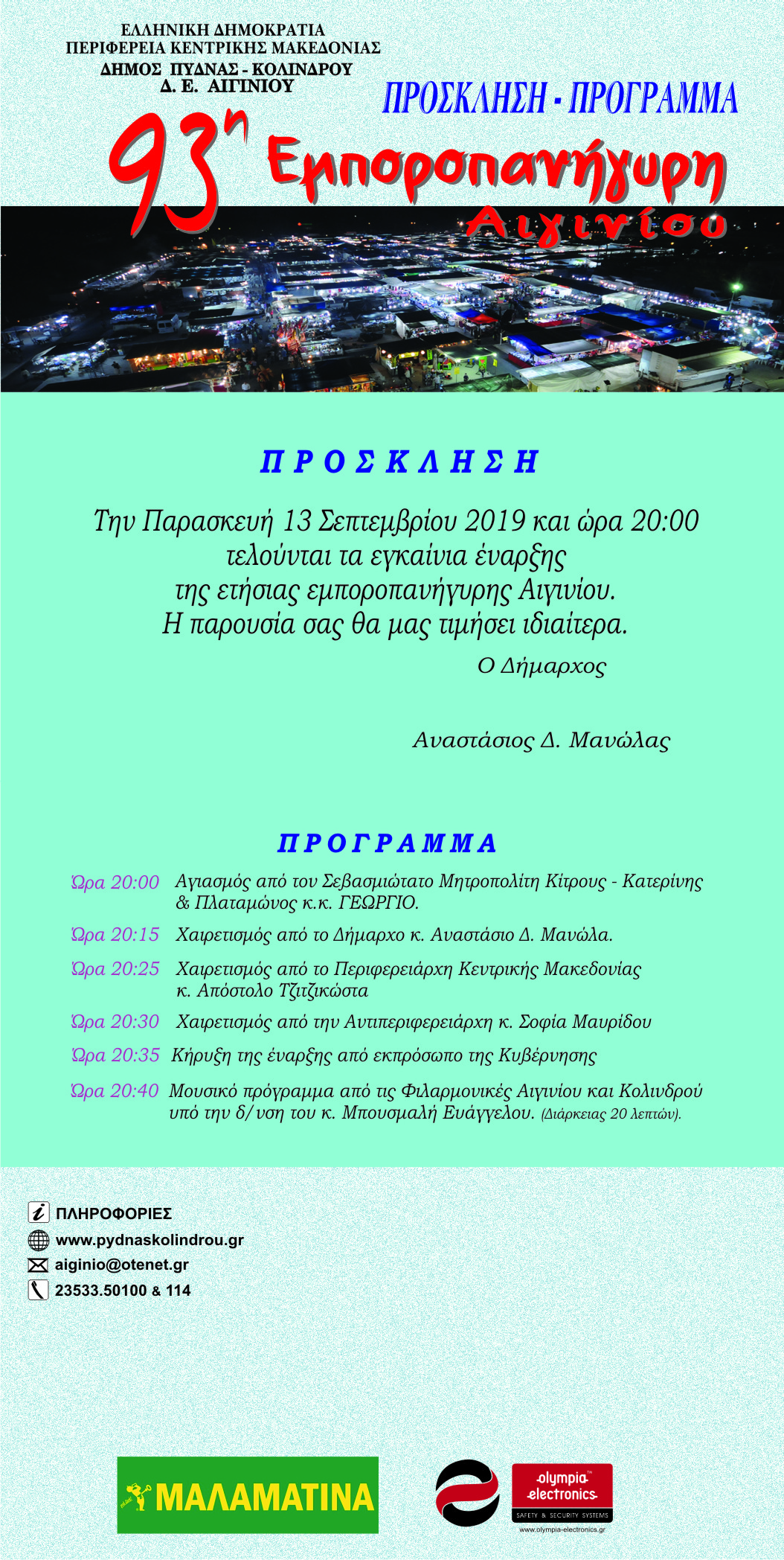 Πρόσκληση Πρόγραμμα των εγκαινίων της 93ης Εμποροπανήγυρης Αιγινίου