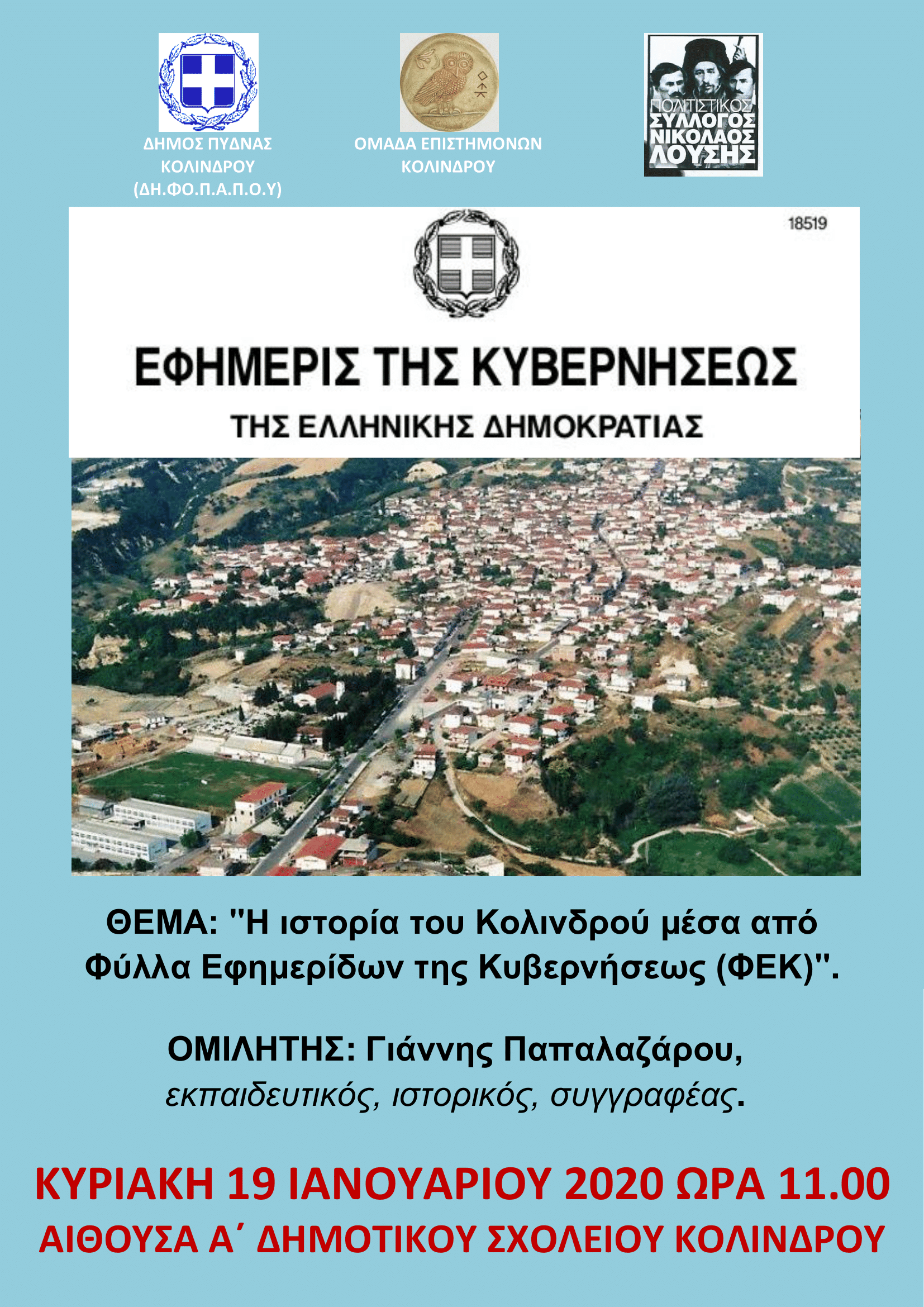 Σας προσκαλούμε να τιμήσετε με την παρουσία σας την εκδήλωση που συνδιοργανώνεται από την Ομάδα Επιστημόνων Κολινδρού, το ΔΗ.ΦΟ.Π.Α.Π.Ο.Υ. του Δήμου Πύδνας-Κολινδρού και τον Πολιτιστικό Σύλλογο "Νικόλαος Λούσης" Κολινδρού: