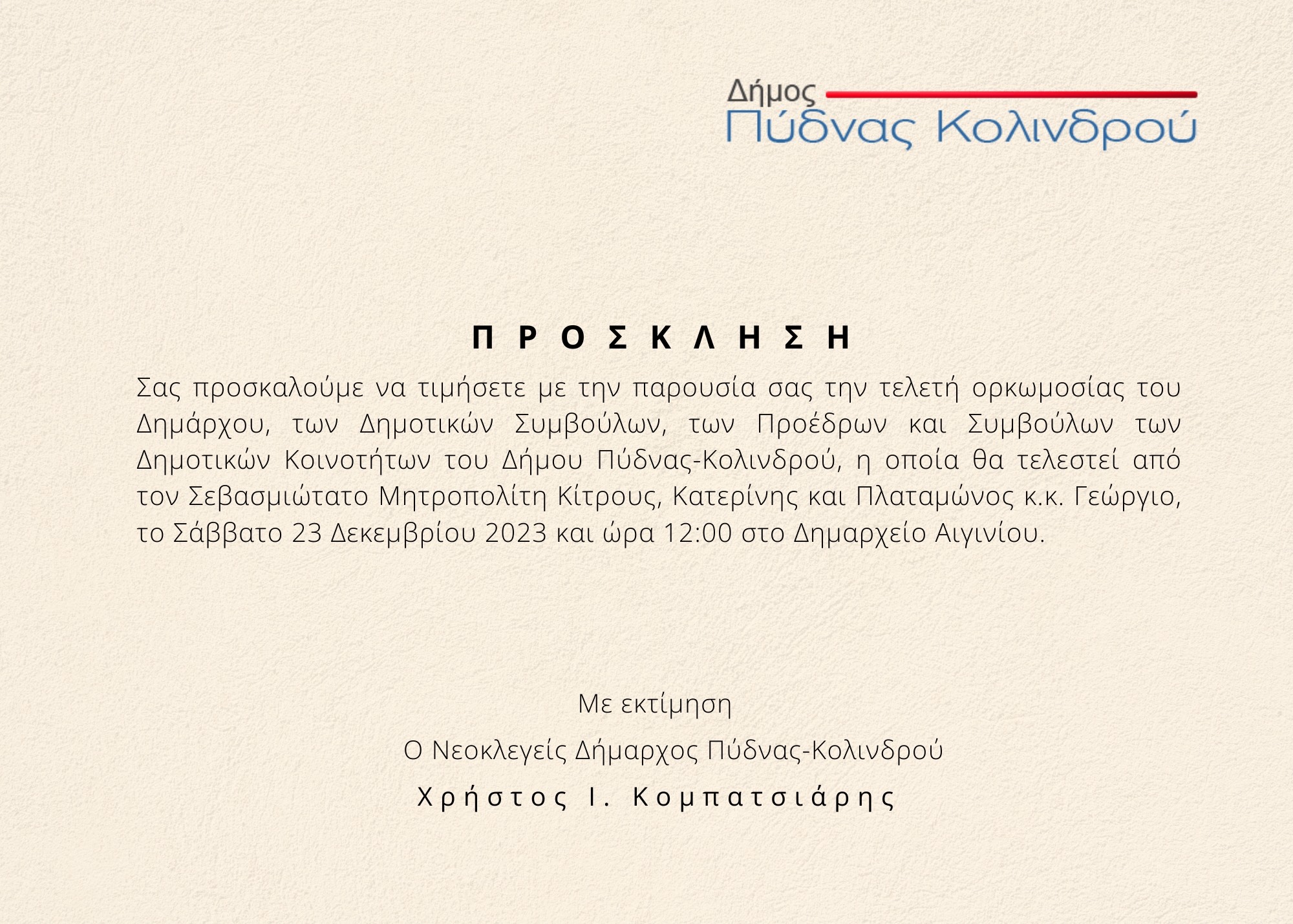 Μετά την επικύρωση της εκλογής και την ανακήρυξη του επιτυχόντος καιτων επιλαχόντων συνδυασμών, σύμφωνα με την υπ’ αριθμ. 57/2023 απόφαση του Πολυμελούς Πρωτοδικείου Κατερίνης, σας προσκαλούμε στο Δημαρχείο Αιγινίου στις 23/12/2023, ημέρα Σάββατο και ώρα12:00, ώστε σε δημόσια συνεδρίαση, να διεξαχθεί η προβλεπόμενη από τοάρθρο 37 του ν. 4804/202 1 ορκωμοσία.