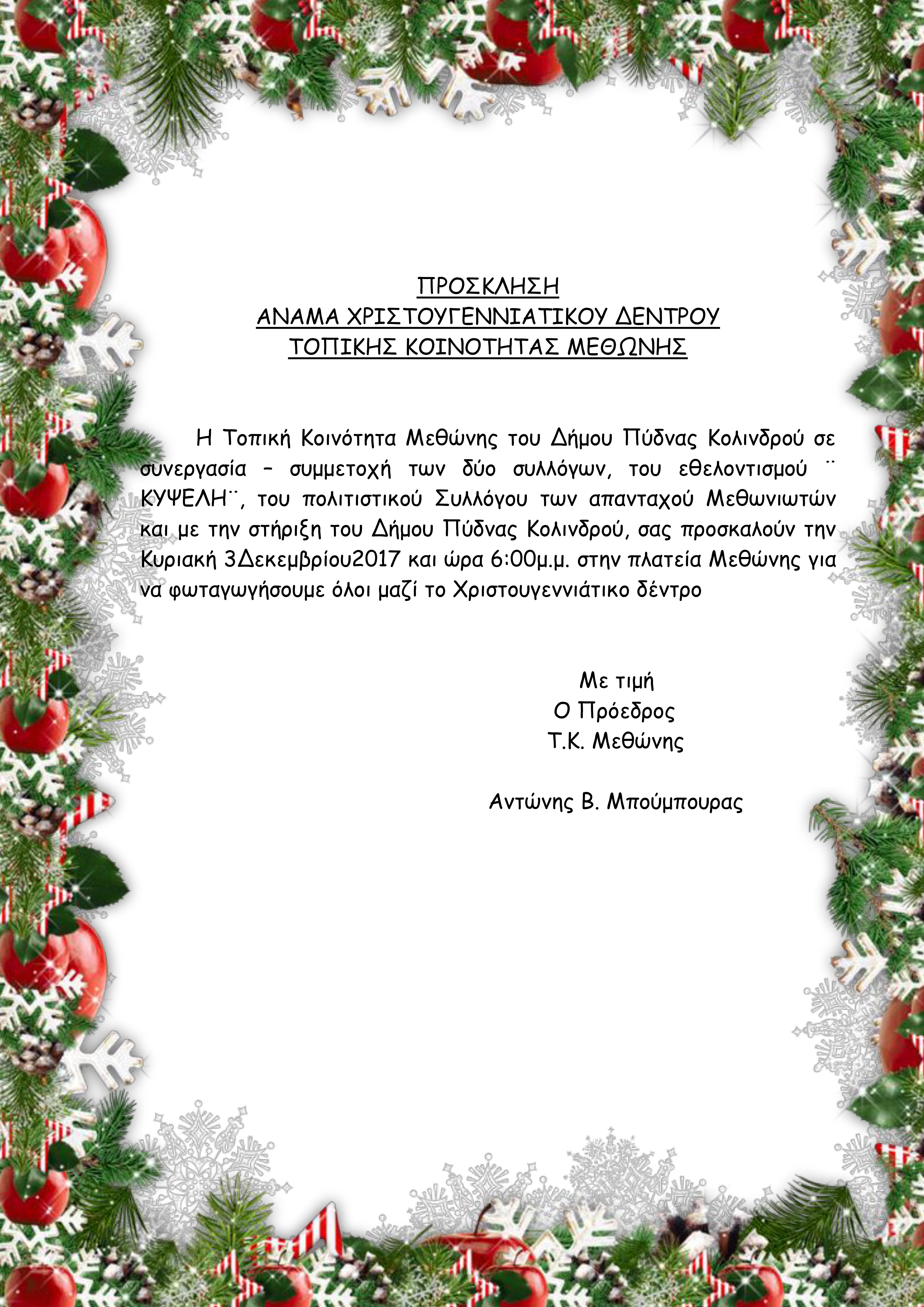 Η Τοπική Κοινότητα Μεθώνης του Δήμου Πύδνας Κολινδρού σε συνεργασία – συμμετοχή των δύο συλλόγων, του εθελοντισμού ¨ ΚΥΨΕΛΗ¨, του πολιτιστικού Συλλόγου των απανταχού Μεθωνιωτών και με την στήριξη του Δήμου Πύδνας Κολινδρού, σας προσκαλούν την Κυριακή 3 Δεκεμβρίου2017 και ώρα 6:00μ.μ. στην πλατεία Μεθώνης για να φωταγωγήσουμε όλοι μαζί το Χριστουγεννιάτικο δέντρο.