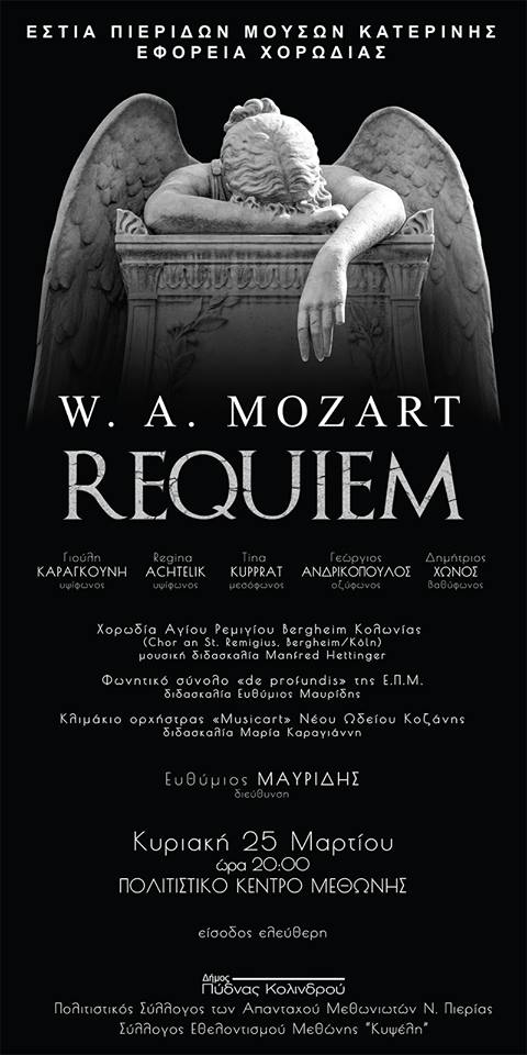 Το «Requiem» του W. A. Mozart, η αριστουργηματική σύνθεση, της δυτικοευρωπαϊκής θρησκευτικής μουσικής, που αποτελεί και το κύκνειο άσμα του σπουδαίου αυστριακού μουσουργού, παρουσιάζεται την Κυριακή 25 Μαρτίου, ώρα 20:00, στο Πολιτιστικό Κέντρο Μεθώνης, στο πλαίσιο των εκδηλώσεων «ΕΑΡΙΝΕΣ ΗΜΕΡΕΣ ΜΟΥΣΩΝ», τις οποίες διοργανώνει η Εστία Πιερίδων Μουσών, με την υποστήριξη του Δήμου Πύδνας Κολινδρού, σε συνδιοργάνωση με τον Πολιτιστικό Σύλλογο Απανταχού Μεθωνιωτών και τον εθελοντικό σύλλογο ¨ΚΥΨΕΛΗ¨