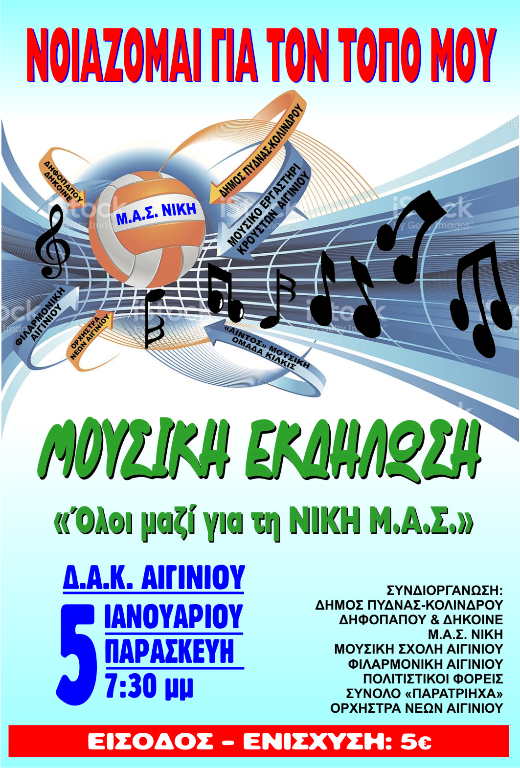 Ο Δήμος Πύδνας Κολινδρού, ο ΔΗ.ΦΟ.Π.Α.Π.Ο.Υ., η ΔΗ.ΚΟΙΝ.Ε., ο Μ.Α.Σ. ΝΙΚΗ, η Μουσική Σχολή Αιγινίου, η Φιλαρμονική Αιγινίου, οι Πολιτιστικοί Φορείς, η Ορχήστρα Νέων και το μουσικό σύνολο ΠΑΡΑΤΡΙΗΧΑ σας προσκαλούν την Παρασκευή 5 Ιανουαρίου 2018 & ώρα 7:30μ.μ. στην Μουσική εκδήλωση «Όλοι μαζί για την ΝΙΚΗ Μ.Α.Σ.»
