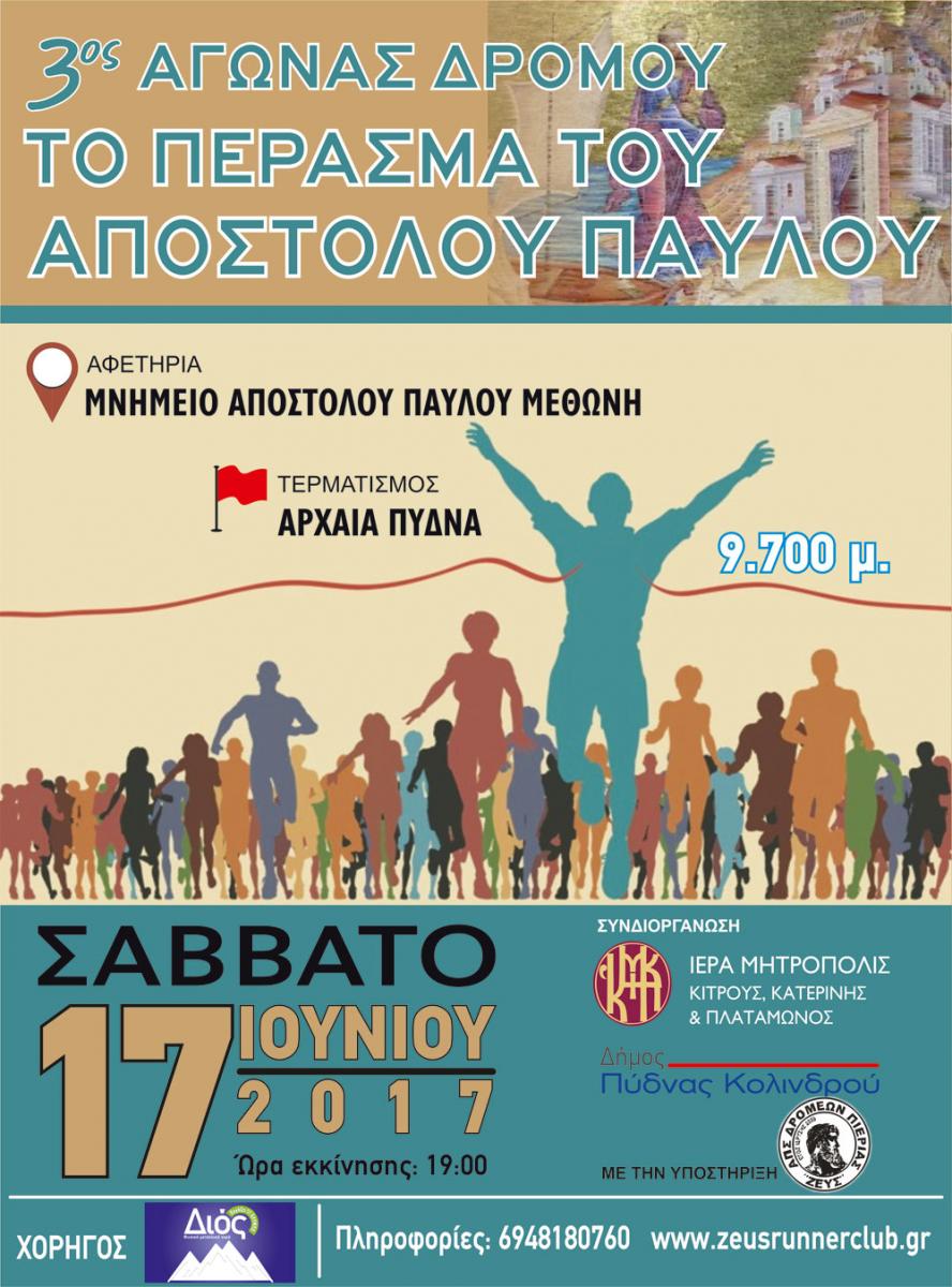 H Iερά Μητρόπολις Κίτρους Κατερίνης και Πλαταμώνος με τον Δήμο Πύδνας Κολινδρού και την υποστήριξη του Αθλητικού Πολιτιστικού Συλλόγου Δρομέων Πιερίας «ΖΕΥΣ» διοργανώνουν και προκηρύσσουν αγώνα δρόμου 9.700μ με την επωνυμία «Το πέρασμα του Αποστόλου Παύλου», το Σάββατο 17 Ιουνίου 2017 και ώρα 19.00.