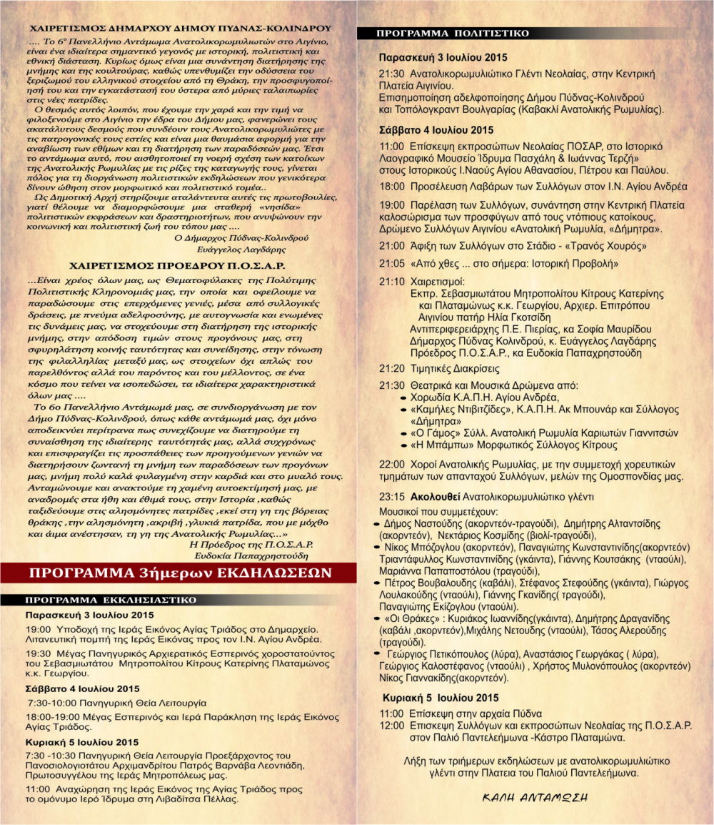 6ο Πανελλήνιο Αντάμωμα Ανατολικορωμυλιωτών στο Αιγίνιο στις 3, 4 & 5-7-2015-Δημοτικό Αθλητικό κέντρο Αιγινίου