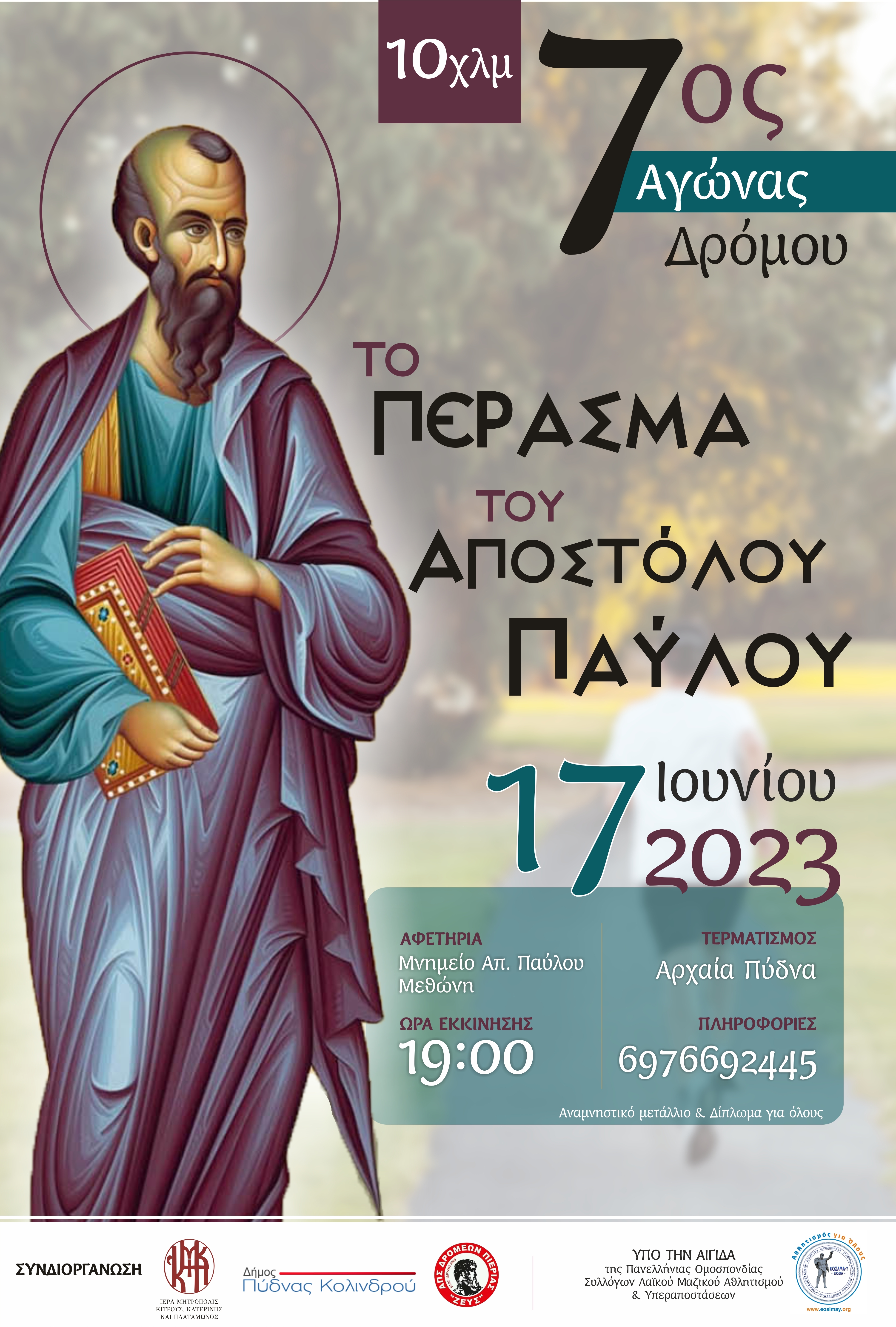 H Ιερά Μητρόπολη Κίτρους, Κατερίνης και Πλαταμώνος με τον Δήμο Πύδνας Κολινδρού και τον Αθλητικό Πολιτιστικό Σύλλογο Δρομέων Ν. Πιερίας «ΖΕΥΣ» διοργανώνουν και προκηρύσσουν αγώνα δρόμου 10.000μ με την επωνυμία «Το πέρασμα του Αποστόλου Παύλου». Ο αγώνας τελεί υπό την αιγίδα της Ελληνικής Ομοσπονδίας Συλλόγων Λαϊκού Μαζικού Αθλητισμού και Υπεραποστάσεων.