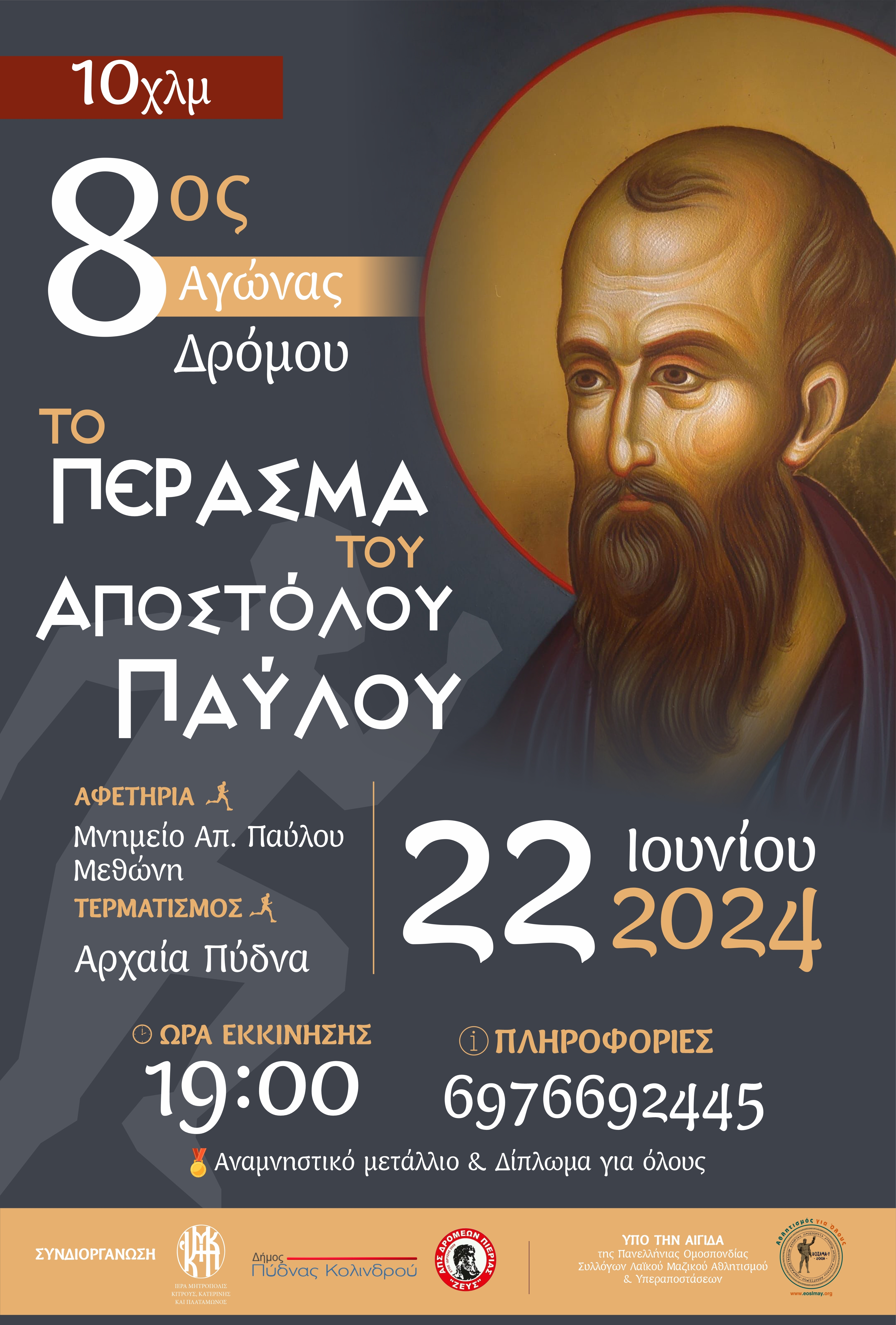 H Ιερά Μητρόπολη Κίτρους, Κατερίνης και Πλαταμώνος με τον Δήμο Πύδνας Κολινδρού και τον Αθλητικό Πολιτιστικό Σύλλογο Δρομέων Ν. Πιερίας «ΖΕΥΣ» διοργανώνουν και προκηρύσσουν αγώνα δρόμου 10.000 μ με την επωνυμία «Το Πέρασμα του Αποστόλου Παύλου». Ο αγώνας τελεί υπό την αιγίδα της Ελληνικής Ομοσπονδίας Συλλόγων Λαϊκού Μαζικού Αθλητισμού και Υπεραποστάσεων. Συμμετέχουν πολιτιστικοί σύλλογοι και φορείς της περιοχής.