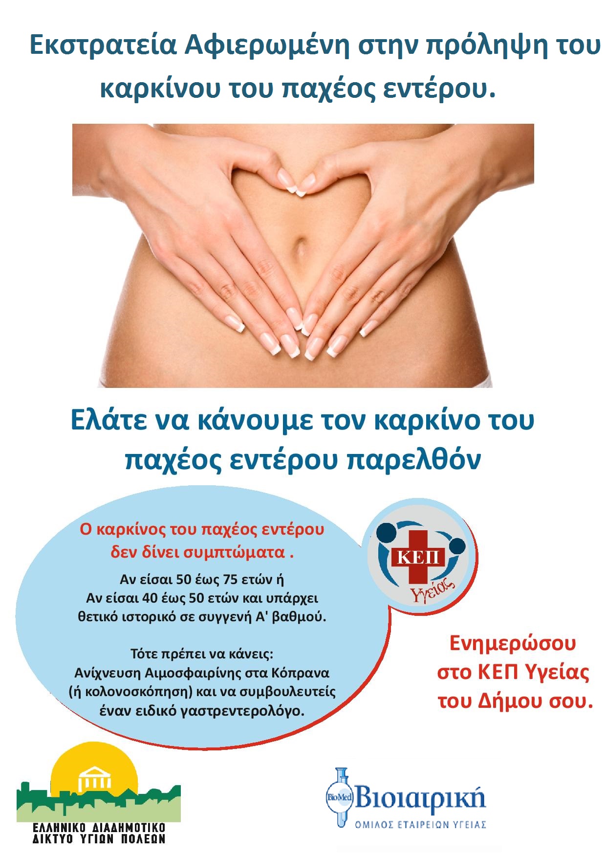 Το ΕΔΔΥΠΠΥ, τα ΚΕΠ ΥΓΕΙΑΣ, η Ελληνική Εταιρία Ογκολογίας Πεπτικού, ο Όμιλος Βιοιατρικής και οι Δήμοι μέλη του ΕΔΔΥΠΠΥ, Διοργανώνουν πανελλήνια εκστρατεία κατά του καρκίνου του παχέος εντέρου , με σκοπό " Να κάνουμε τον καρκίνο του παχέος εντέρου παρελθόν."