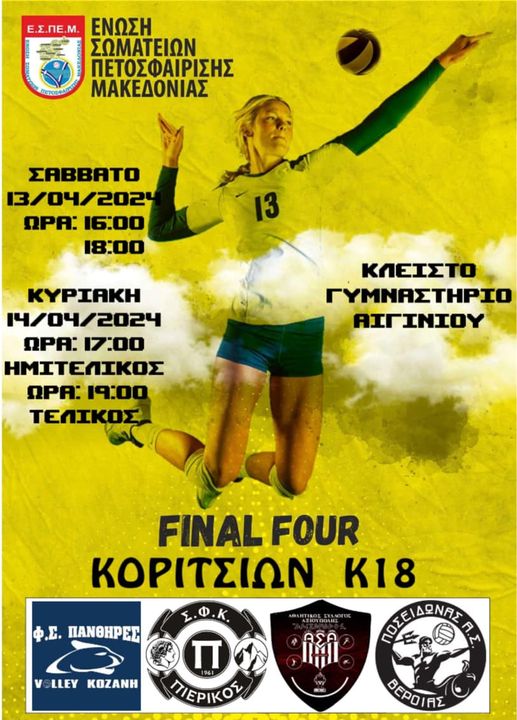 Σε συνεργασία με την Ένωση Σωματείων Πετοσφαίρισης Μακεδονίας (ΕΣΠΕΜ), το Σάββατο στις 13 Απριλίου στις 16:00 & 18:00 και Κυριακή 14 Απριλίου στις 17:00 & 19:00 στο ΔΑΚ Αιγινίου.
