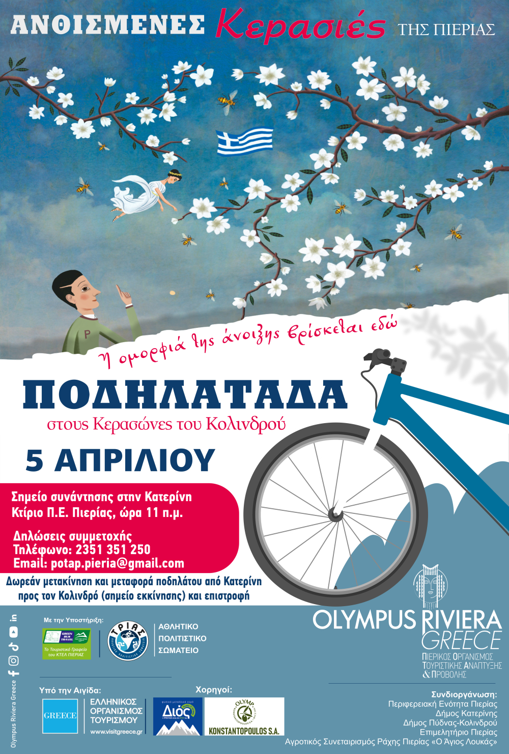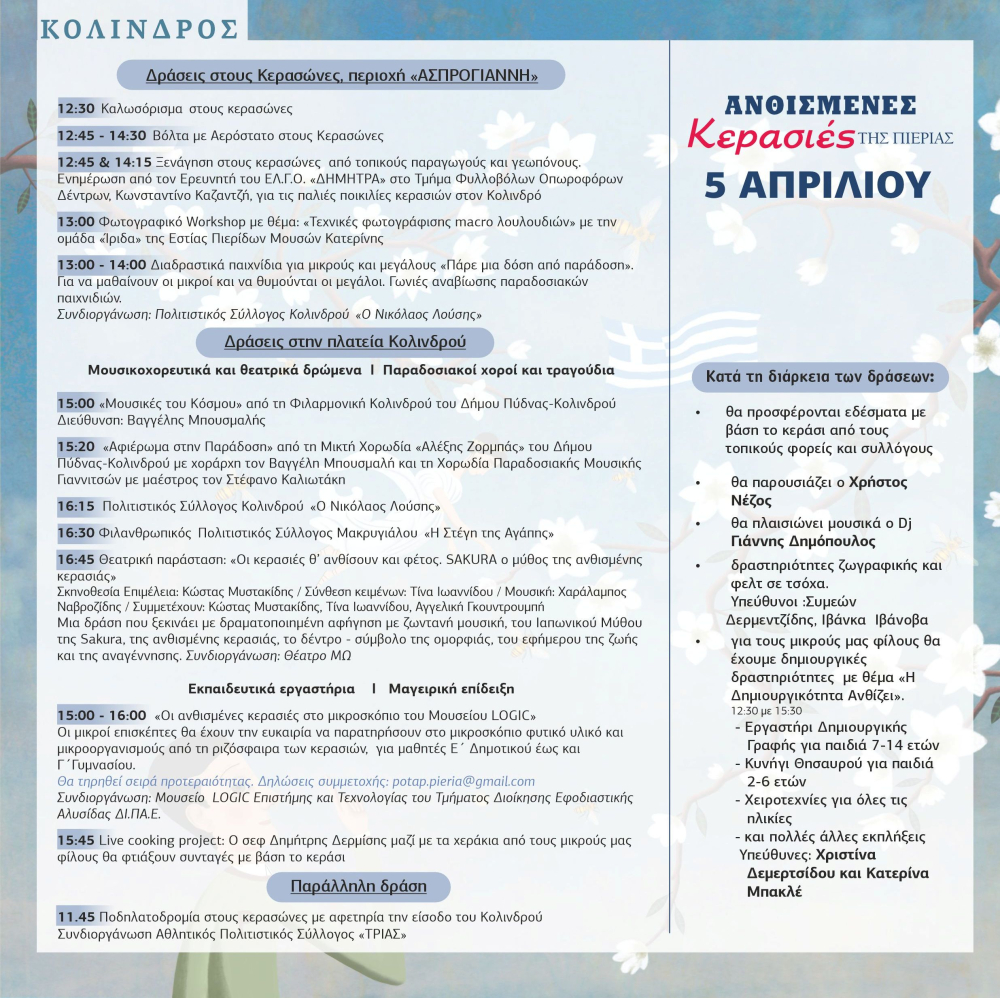 Ο ΔΗΜΟΣ ΠΥΔΝΑΣ-ΚΟΛΙΝΔΡΟΥ, σε συνεργασία με την Περιφερειακή Ενότητα Πιερίας και το Επιμελητήριο Πιερίας, υπό την αιγίδα του ΕΟΤ και του Πιερικού Οργανισμού Τουριστικής Ανάπτυξης και Προβολής, διοργανώνει στις 5 Απριλίου την εκδήλωση «Ανθισμένες Κερασιές της Πιερίας» στον Κολινδρό.